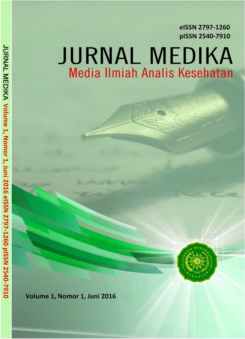 Jurnal Medika (Media Ilmiah Analis Kesehatan) merupakan jurnal yang menerbitkan artikel penelitian di bidang Teknologi Laboratorium Medis dengan fokus dan ruang lingkup sebagai berikut: Kimia Klinik, Mikrobiologi, Parasitologi, Imunoserologi, Toksikologi Klinik, Hematologi, dan Sitohistoteknologi. Jurnal Medika terbit sebanyak 2 kali pada bulan Juni dan Desember dengan ISSN (Online): 2797-1260, DOI: https://doi.org/10.53861/medika. Surat Keputusan Jurnal Terakreditasi Nasional No. 79/E/KPT/2023 tentang Peringkat Akreditasi Jurnal Ilmiah Periode I Tahun 2023 (Sinta 5). Jurnal Medika diterbitkan oleh Lembaga Penelitian dan Pengabdian kepada Masyarakat Politeknik Muhammadiyah Makassar. |